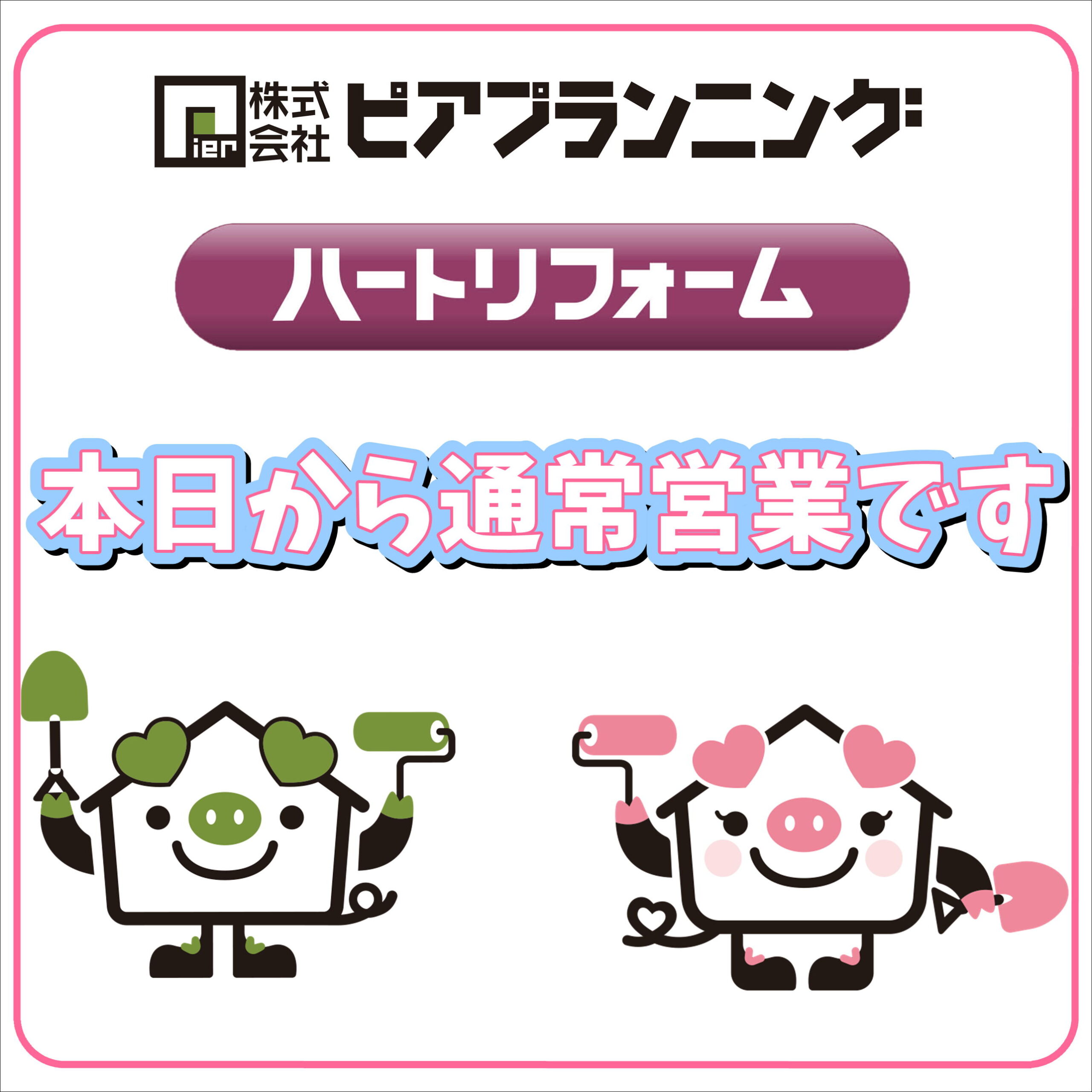 謹賀新年 旧年中は格別のお引き立てを賜り 厚く御礼申し上げます 本年も変わらぬご愛顧のほど よろしくお願い申し上げます ハートリフォームは本日より通常営業...