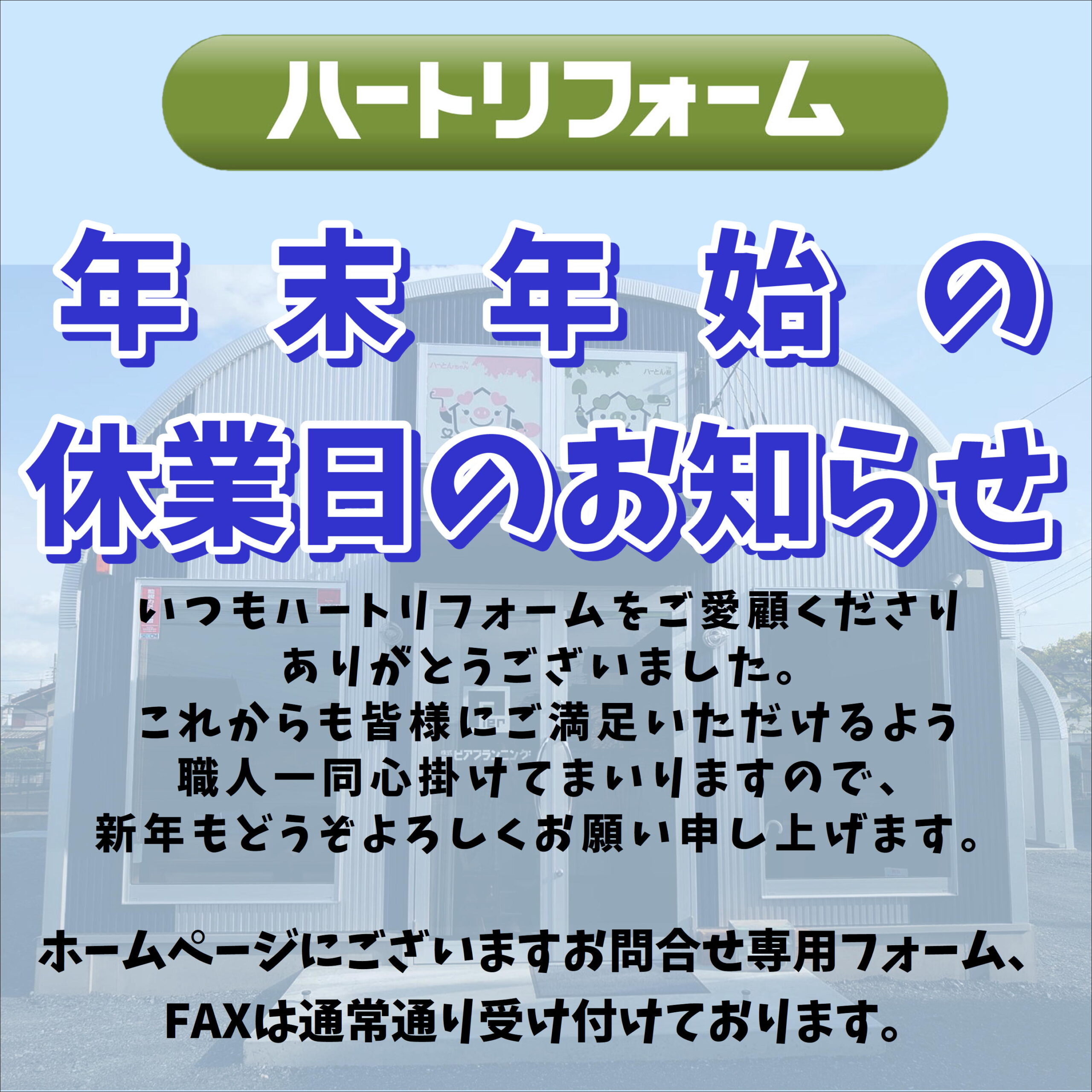 こんにちは! 2023年年末から2024年年始にかけての休業に関するお知らせです。 誠に勝手ながらハートリフォームでは、 2023年12月28日(木)から2024年1月8日(...